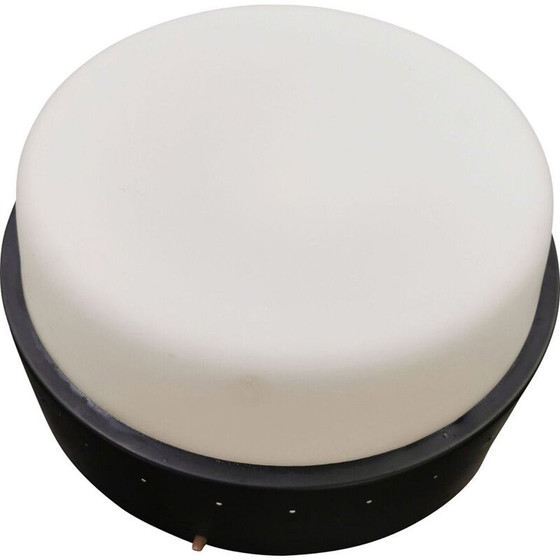 toegeschreven aan STILNOVO Een plafondlamp uit de jaren 1960. Beschilderd plaatstaal, gelakt aluminium, gematteerd "Triplex Opal" glas. Hoogte 15 cm, diameter 30 cm.