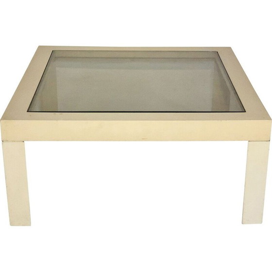 Vintage salontafel met plastic onderstel en glazen blad. De 4 poten kunnen worden verwijderd. Het glazen blad is beschermd omdat het in de salontafel is ingebouwd, maar kan worden verwijderd voor transport. De set is in gebruikte staat, het plastic heeft gebruikssporen.