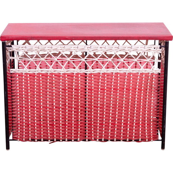 Vintage wasmand, gemaakt in de jaren 1980 in Tsjecho-Slowakije. De bovenkant is bekleed met kunstleer en de structuur is van plastic. Het geheel is in goede vintage staat, het touw is op verschillende plaatsen beschadigd.