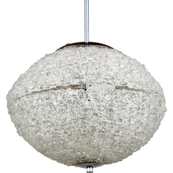 Austrolux hanglamp met unieke getextureerde plexiglas kap en chromen details uit de jaren 1960. Wat oppervlakkige krassen en slijtage op plastic en metalen onderdelen.