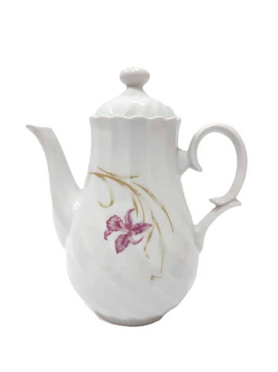 Deze prachtige vintage porseleinen koffie- of theekan getuigt van tijdloze elegantie en vakmanschap. De delicate witte porseleinen body is versierd met een charmant roze bloemenmotief, versterkt door subtiele gouden accenten die een vleugje verfijning toevoegen. De sierlijke rondingen en het klassieke ontwerp van de kan maken hem een perfecte aanvulling op elk verfijnd thee- of koffieservies.