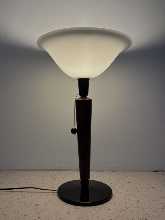 De lamp beschikt over een ellegante frosted glazen kap die zorgt voor een difuus licht met een zachte uitnodigende gloed. De taps toelopende bruine steel wordt verankert op een stevige zwarte ronde voet. Met een trekkoord schakelaar kan de lamp worden bediend.