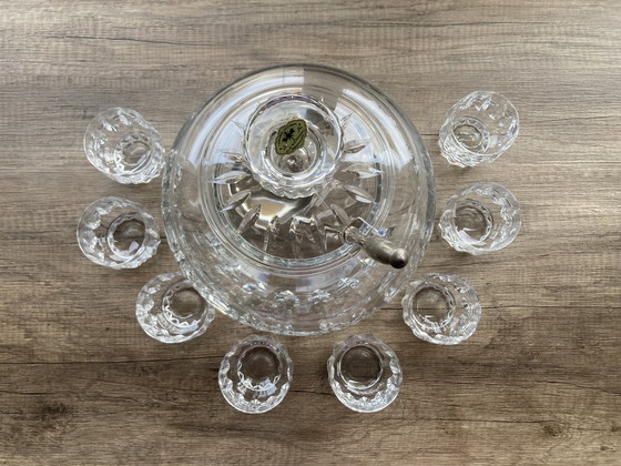 Vintage kristallen punchset van Kisslinger-Rattenberg, Oostenrijk. Handgemaakt kristal. 1 grote punchkom met deksel, 8 bijpassende glaasjes en een bijpassende schenklepel. Alles nog in perfecte staat.