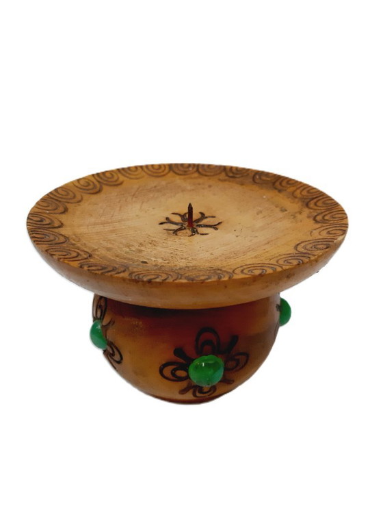 Deze prachtige vintage kaarsenhouder met pyrografiehout getuigt van tijdloos vakmanschap. Versierd met ingewikkelde pyrografieontwerpen en verfraaid met opvallende groene stenen, straalt hij een aura van elegantie en geschiedenis uit. Perfect om een vleugje vintage charme toe te voegen aan elke setting, is dit stuk zowel een functionele kaarsenhouder als een decoratief object.