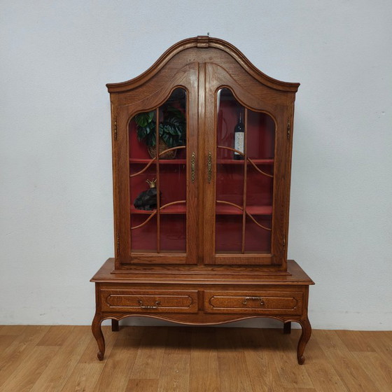 Landelijke, brocante Queen Ann vitrinekast. Deze kast bestaat uit twee delen. Het Bovenste gedeelte heeft twee openslaande deuren met werkende sloten en sleutels, daarachter twee ruime planken die net als de achterwand zijn bekleed met roodvelours. Het onderste gedeelte heeft twee ruime lades.