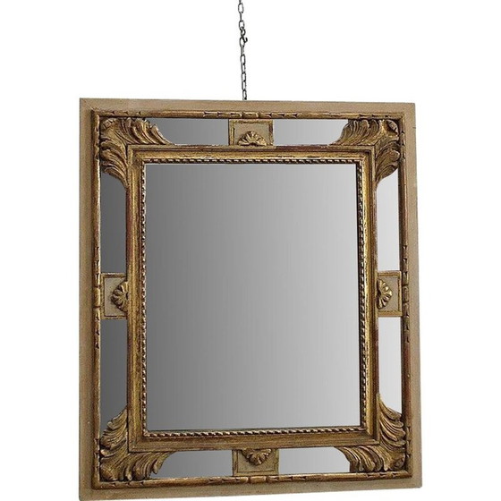 Kleine spiegel uit de twintigste eeuw, met een frame van 8 kleine spiegels.De rand is in elke hoek verrijkt met belangrijke versieringen van bladeren in reliëf en kleine ornamenten die bloemen vormen in het midden.Dit decoratieve object presenteert een centrale spiegel omlijst met verguld houten lijstwerk.De achterkant is gemaakt van hout en voorzien van een ijzeren ring, waardoor het kan worden opgehangen in de kamer waarvoor u het wilt gebruiken.De weelderige en authentieke stijl van deze prachtige spiegel zal aanwezigheid brengen in uw huis. Hij past harmonieus in zowel een traditioneel als een meer hedendaags interieur. Periode : Begin XXe eeuw.Perfecte staat. Geen ontbrekende onderdelen. Origineel kwikglas in goede staat.Mogelijkheid om meer foto's te sturen op aanvraag.Ref : 702 S
