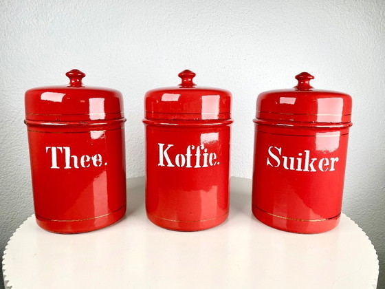 Cute set of three matching vintage storage tins in bright retro red with Dutch labels for "Thee" (tea), "Suiker" (sugar) and "Koffie" (coffee). Likely dating from the 1930s-1940s.