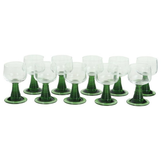 Deze wijnglazen waren heel populair in de jaren 70 en werden gemaakt in 2 verschillende formaten, dit zijn de kleinste. Ze worden ook wel Roemer of Römer glazen genoemd en zijn heel herkenbaar aan de groene voet en steel met steeds bredere ringen.