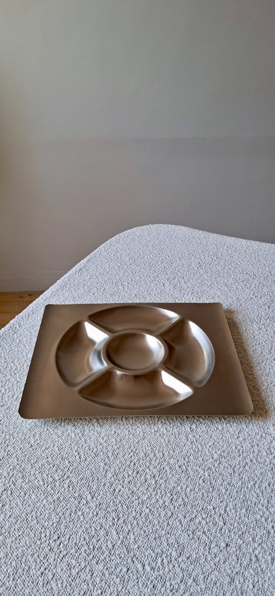 Een prachtig roestvrijstalen serveerblad uit de jaren 80, in de stijl van het iconische Franse merk Guy Degrenne. In zeer goede algehele staat, met slechts enkele lichte gebruikssporen, voegt het een vintage tintje toe aan uw aperitieven. Het grafische en elegante ontwerp maakt het ook een stijlvol opbergbakje, of zelfs een puur decoratief object, bijvoorbeeld tegen de muur.