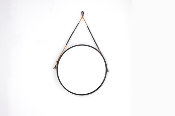 Vintage ronde spiegel van matzwart gelakt metaal, opgehangen aan een leren koord.