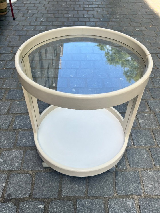 Een mooie stijlvolle ronde trolley / barcart in space age stijl. Gemaakt in de 1970's. Het meubel is gemaakt uit in crème gelakt hout en is aan de bovenkant voorzien van een glazen- en aan de onderkant voorzien van een houten blad. Hij is ook perfect te gebruiken als bijzet- of salontafel. Het meubel staat op chromen draaiwieltjes. Hij is in nette conditie, heeft wat gebruikssporen welke horen bij de leeftijd.