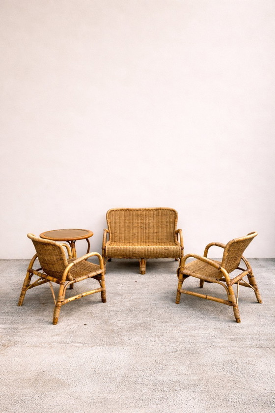 Vintage rotan tuinset – bank, 2 fauteuils en salontafel (jaren 70)