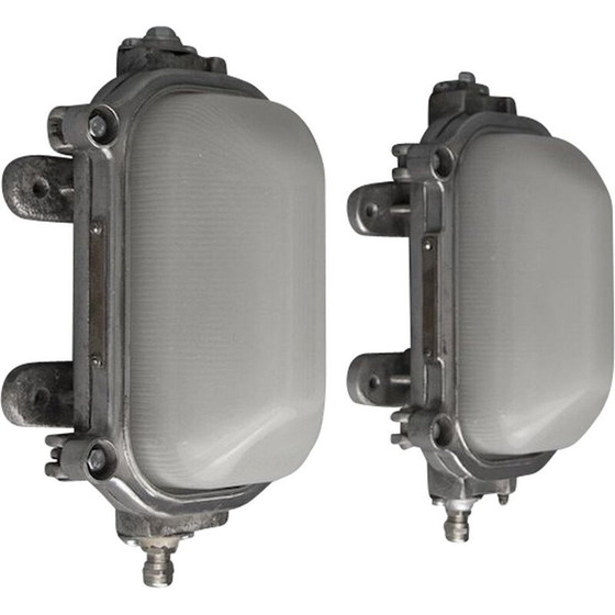 Russische marineschotten geborgen uit afgedankte vrachtschepen in India. Geëtste prismatische lens en gepolijste aluminium behuizing met origineel versleten fabrikantenplaatje. Geleverd met nieuwe E27 lamphouders.
