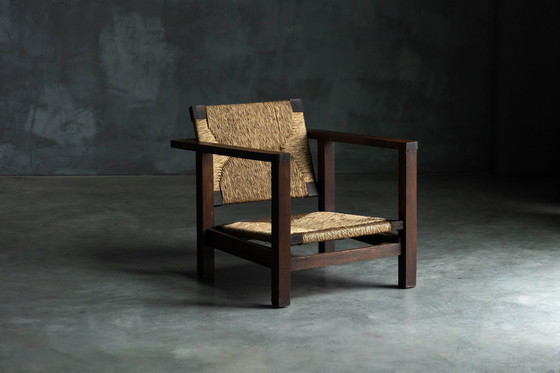 Modernistische loungestoel uit de jaren 1950 is een opvallende combinatie van vorm en functie. Het strakke, kubusvormige silhouet is gemaakt van massief eikenhout en straalt tijdloze elegantie uit. De geweven zitting en rugleuning, gemaakt van natuurlijk handgeweven biezen, zorgen voor een warm, texturaal contrast met de donkere afwerking van het hout. Ontworpen met een laag profiel, biedt het ontspannen comfort terwijl het een rustiek-moderne esthetiek uitstraalt.