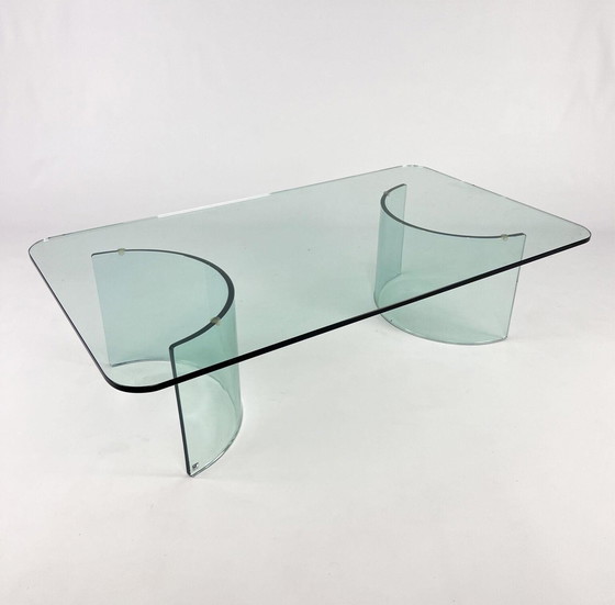 Vintage Adam Coffee salontafel Adam van Gallotti & Radice Prachtige zware glazen salontafel van ontwerper Pierangelo Gallotti voor Gallotti en Radice. Deze tafel is een ontwerp uit de jaren 80. De glazen halve cirkels kunnen naar binnen of naar buiten worden gedraaid. Hierdoor krijgt de tafel elke keer een andere uitstraling. De tafel verkeert in goede staat met wel hier en daar kleine gebruikssporen zoals wat butsjes in de poten, en krasjes aan het blad. Richtprijs is doorgaans gemiddeld €800. Door de bovengenoemde gebruikssporen nu voor €500