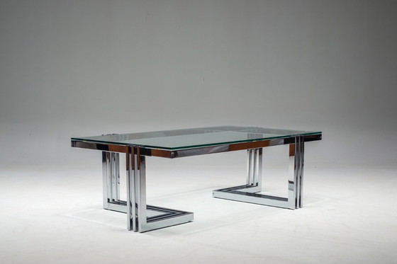 Salontafel van verchroomd metaal en mat glas. Het minimalistische ontwerp en de stevige constructie van de tafel maken het een veelzijdige toevoeging aan elke moderne leefruimte.