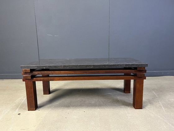 Prachtige houten salontafel met een zwart stenen tafelblad.
