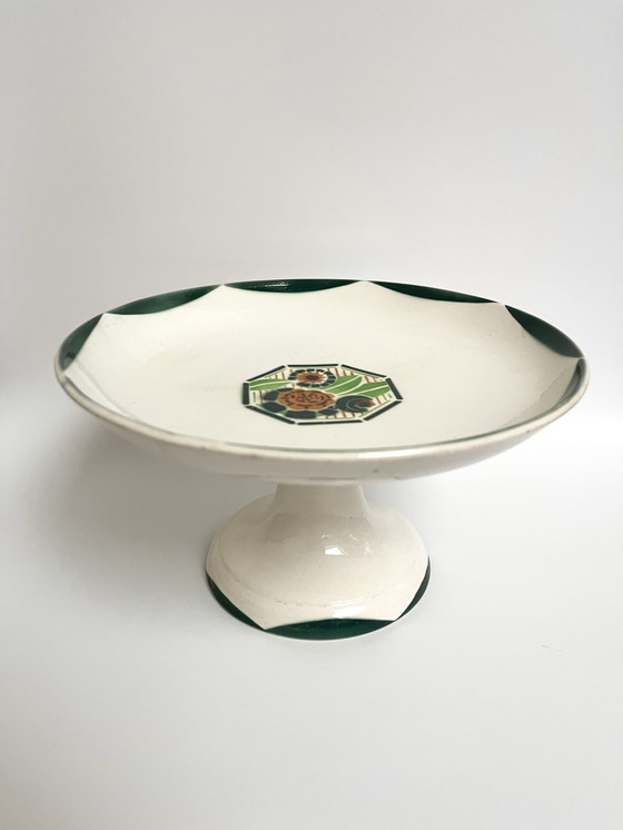Charmante vintage serveerschaal op voetstuk van geglazuurd faience, gesigneerd in Sarreguemines, Frankrijk.