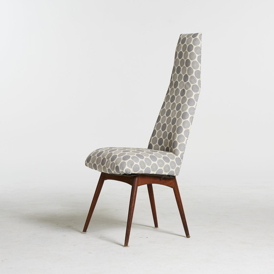 Architecturale stoel met hoge rug, geproduceerd in Denemarken. Het heeft een teakhouten frame met mooie stoffen bekleding. Conditie: enkele gebruikssporen, later opnieuw bekleed. Afmetingen: hoogte 125 cm, breedte 50 cm, diepte 60 cm, zithoogte 52 cm