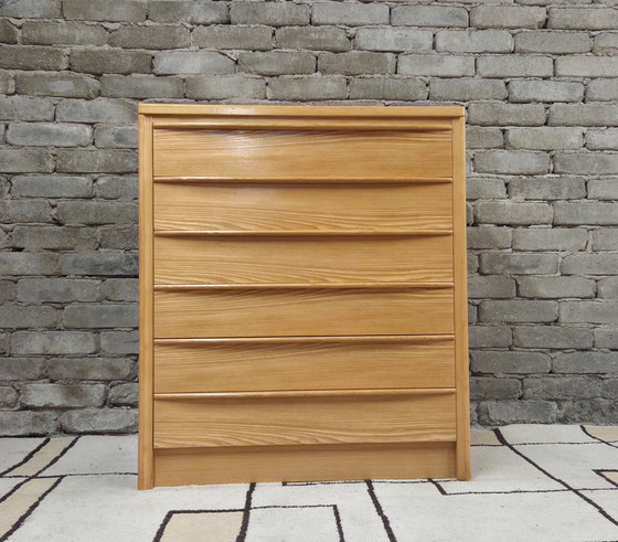 Ontdek deze vintage Scandinavische commode van massief hout, een waar toonbeeld van design uit de jaren 70. Met zijn zes ruime lades biedt hij een elegante en functionele opbergoplossing voor uw huis.
