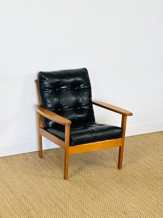 Vintage Scandinavische fauteuil van zwart leer en hout, 1960