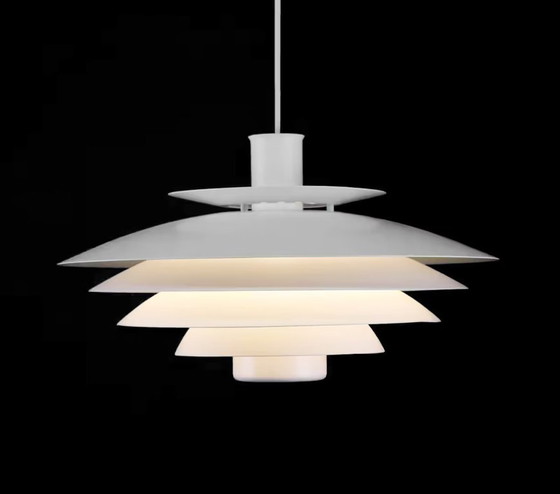 Een schitterende, iconische Deense hanglamp van Scandinavisch design in de grootste uitvoering, bestaande uit zes wit gepoedercoate metalen kappen.