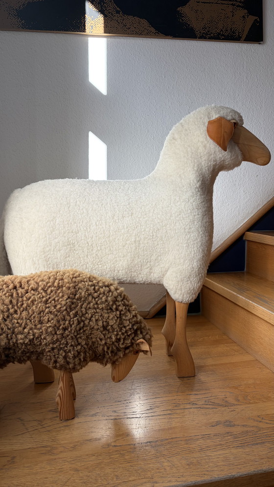 Een set van twee schapen. Het kleinere schaap heeft krullende bruine wol die al wat begint te verkleuren. Het grotere schaap heeft een dichte wollen vacht (geen bont). Het grotere schaap is 84 cm hoog en 84 cm lang. Het kleinere schaap is 38 cm hoog en 50 cm lang. Ze zijn gemaakt van massief beukenhout en kunnen als krukjes gebruikt worden.