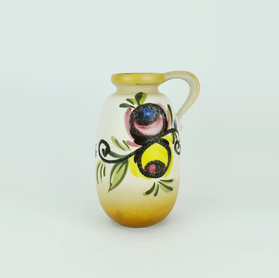 Zeer mooie vaas uit het midden van de 20e eeuw, vervaardigd door Scheurich West-Duitsland in de jaren 60. Gemerkt aan de onderkant met modelnummer 484-27. Hoofdkleuren: wit tot lichtbruin, versierd met een prachtig bloemmotief in diverse mooie kleuren en afgewerkt met een lavaglazuur.