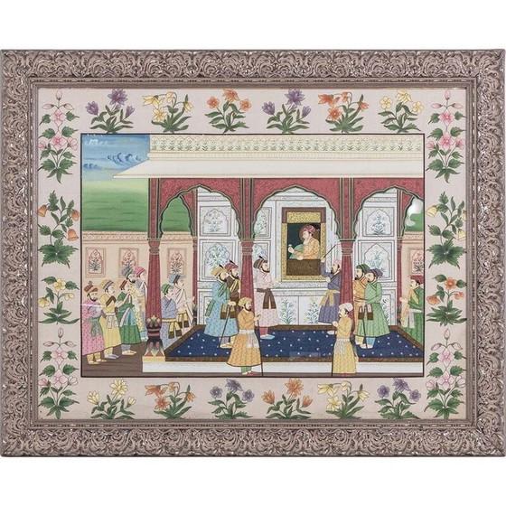 Aquarel in Indiase stijl op zijde met een voorstelling van een paleisachtig tafereel, de figuren gekleed in traditionele gewaden, omringd door een fries versierd met bloemen en gevat in een grijs gelakt frame van houtsnijwerk.