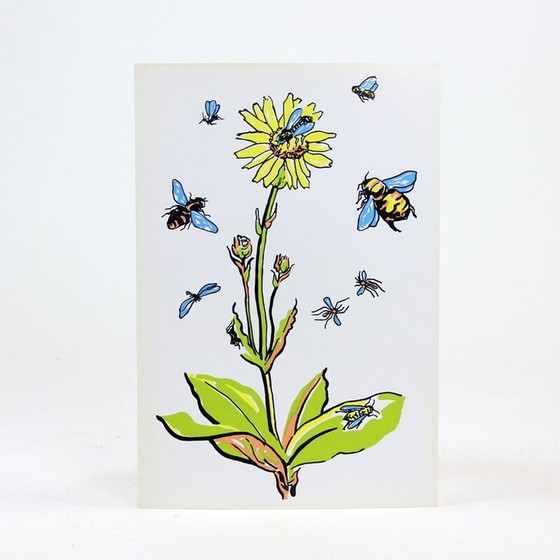 Groot kleurrijk wandkunstwerk. Voorstelling van een bloeiende plant met bijen eromheen. Dit stuk maakte oorspronkelijk deel uit van een set die sinds de jaren 1960 werd gebruikt in een school in Tsjecho-Slowakije. Gemaakt van plastic. Goede staat met wat patina op het plastic en de randen. Heldere en mooie kleuren. Kan gemakkelijk worden ingelijst.