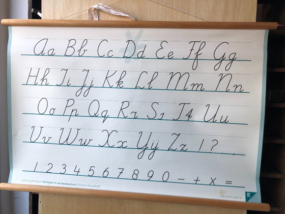 Vintage schoolplaat schoolkaart Schrijven - cijfers en letters - dubbelzijdig 100 x 66 Wolters Noordhoff als nieuw