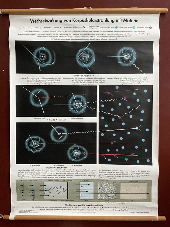 Een schitterend exemplaar: vintage schoolposter Wechselwirkung van Korpuskularstrahlung mit Materie.