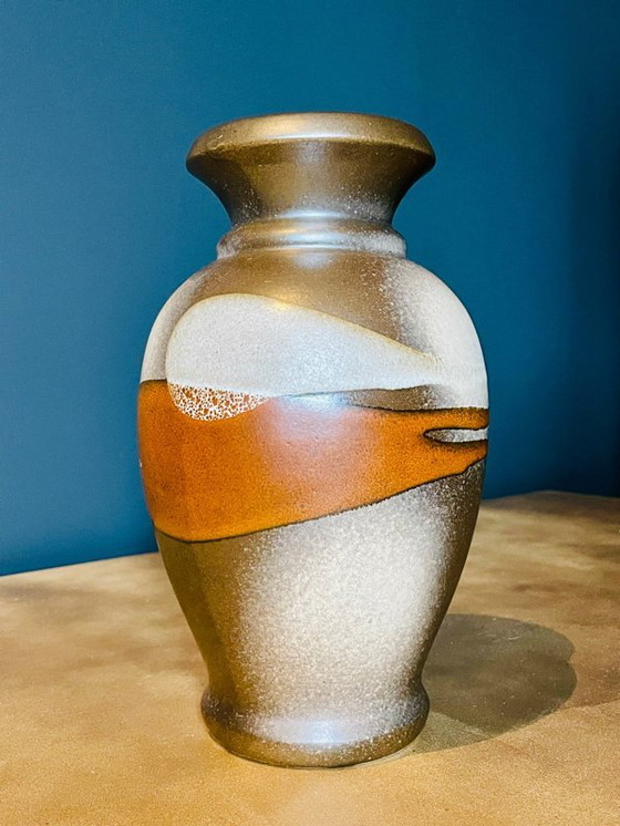 Een unieke, handgemaakte vaas van keramiek die een brug slaat tussen kunst en functie. Dit sculpturale stuk heeft een rijk, aards glazuur in gelaagde tinten van terracotta, zand en cacao - wat doet denken aan abstracte landschappen of natuurlijke rotsformaties.