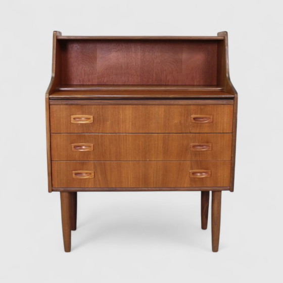 Deze fantastische mid century secretaire is gemaakt van teak hout. Hij heeft drie lades en een uitschuifbaar werkblad. Hij is bijzonder vormgegeven doordat hij naar voren lijkt te hangen (zie zij-aanzicht). Deze wandkast of bureau, is gemaakt in Denemarken en van mooie kwaliteit. Het is een iconisch mid century meubel dat zowel praktisch is als stijlvol. Typisch jaren '60 en perfect voor in een modern eclectisch interieur!