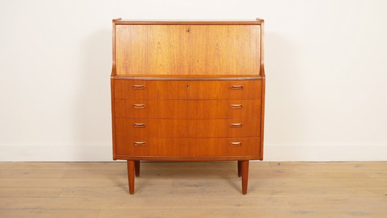 Deze vintage secretaire is afkomstig uit Denemarken en heeft een klassieke en elegante uitstraling. De kast is gemaakt van teak hout en is voorzien van genoeg opbergruimte. De klep van de kast opent doormiddel van 2 scharnieren, waardoor er een fijne werkplek ontstaat. Binnenin vind je nog een prachtig afgewerkte kast met 6 kleine lades en 2 schuifdeurtjes. Onderin vind je 4 grote lades waardoor er meer dan genoeg opbergruimte is in deze compacte kast.