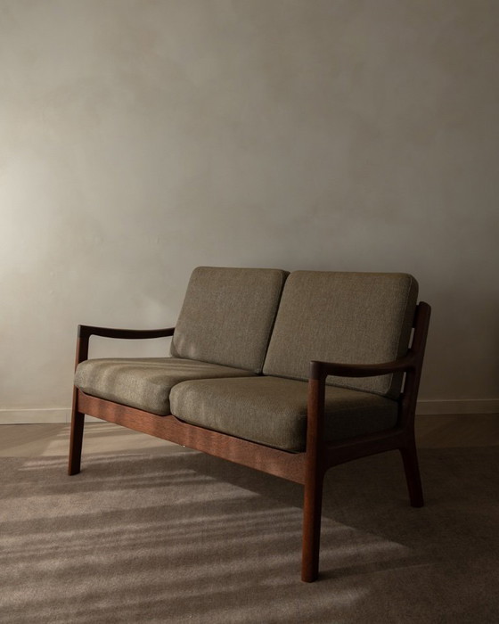 Een prachtig geproportioneerde vintage Senator tweezitsbank van Ole Wanscher voor Cado, gemaakt in Denemarken en geworteld in de ingetogen verfijning die Wanschers werk zo kenmerkt. De Senator-serie is geliefd vanwege de balans tussen elegantie en ingetogenheid: sculpturale armleuningen, subtiel taps toelopende poten en een frame dat architectonisch aanvoelt zonder ooit zwaar te worden.