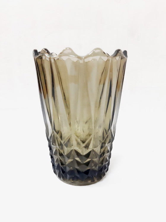 Vorm van zaagtandgeslepen glas op de rand. Mid-century stijl. In een mooie rookgroene kleur.