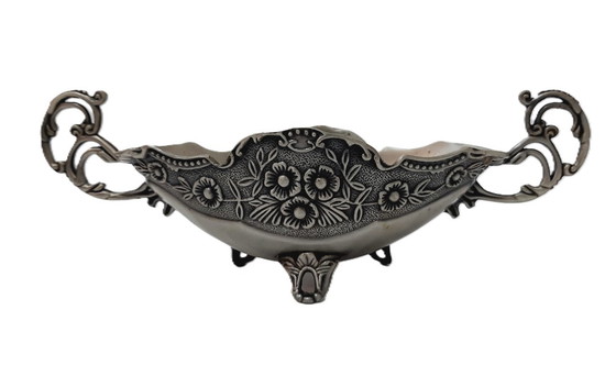 Deze prachtige vintage snoepschaal van tin straalt elegantie en charme uit, perfect om een vleugje verfijning toe te voegen aan elke setting. Het sierlijke ontwerp, met ingewikkelde bloemmotieven en sierlijk gebogen handgrepen, weerspiegelt een tijdloze esthetiek die zowel bij traditionele als moderne interieurs past.