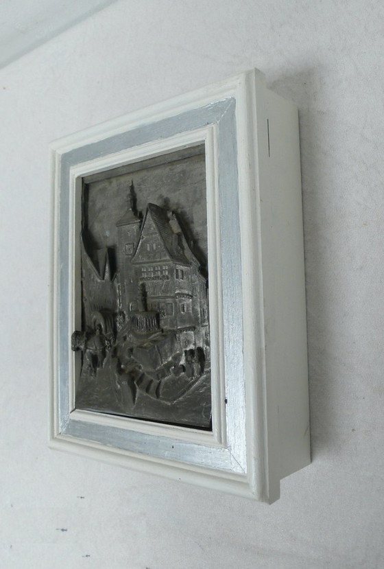Vintage sleutelkastje hout wit + 3D tinnen afbeelding dorpsgezicht