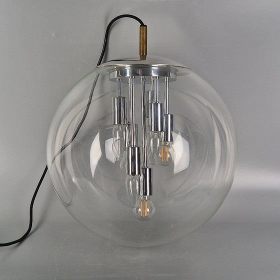 Opvallende vintage hanglamp uit de jaren 60 in karakteristieke Space Age of Sputnik stijl. De lamp heeft een grote, heldere glazen bol met een diameter van 40 cm, en een binnenstructuur van verchroomd metaal met zeven E14 fittingen in een speelse, geometrische compositie.
