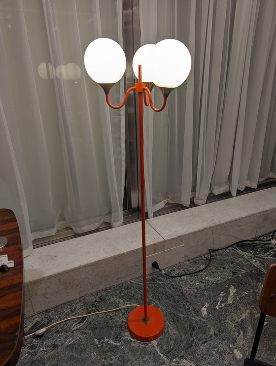 De vloerlamp heeft 3 bollampen van matglas met een oranje metalen basis en messing details onder de lampen. In goede werkende staat.