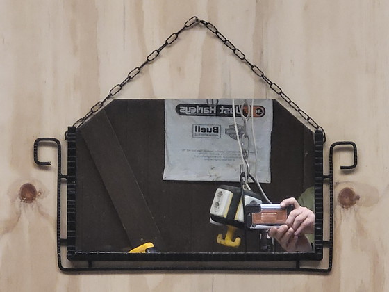 Deze vintage spiegel in brutalistische stijl is een unieke toevoeging aan elk interieur. Het robuuste ontwerp met een metalen frame en ketting geeft een stoere uitstraling die perfect past in een industriële of moderne setting. De spiegel is zowel functioneel als decoratief, ideaal voor in de hal, woonkamer of slaapkamer.