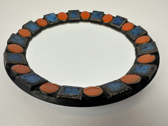 Vintage W. Germany spiegeltje. Keramiek bezet met geglazuurde tegeltjes. Diameter: 20cm. Diepte: 3cm. Voorzien om op te hangen. Gewicht: 500g.