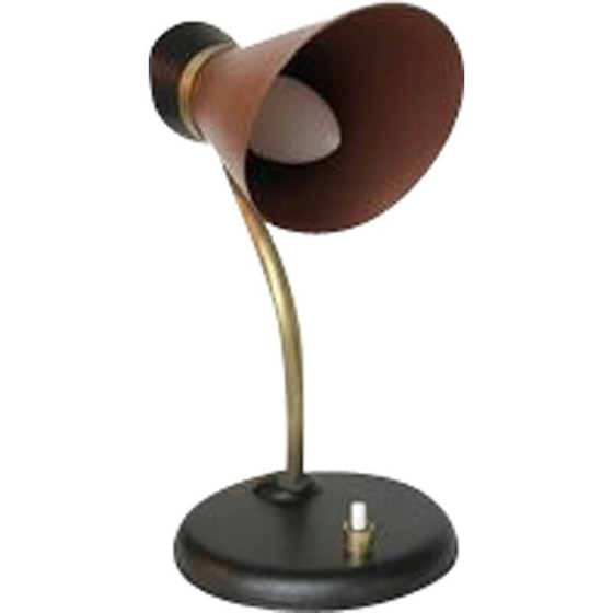 Kleine spot gerestaureerd en bijgewerkt. De originele blauwe verf is verwijderd om het materiaal of de arm, messing, te laten zien. De rest van de onderdelen is opnieuw geschilderd in zwart en koper.