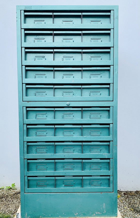 De kast is door de vorige eigenaar geschilderd in de huidige groene kleur en voorzien van tientallen stevige laden, compleet met de kenmerkende grepen en labelhouders. Ideaal om te gebruiken als opbergmeubel, archiefkast of verzamelobject.