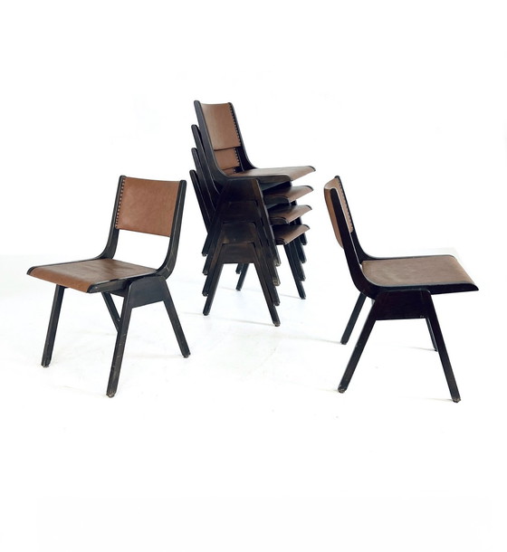 Set van 6 vintage stapelstoelen uit de jaren ‘60 (meerdere sets van 6 beschikbaar). Prachtige massief houten stapelstoelen in de stijl van Roland Rainer. Houten voet in haakse verbinding. Bruine skai stoffering nog in nette staat. Afgewerkt met sierlijke popnagels. Leuke stoel voor in winkel, horeca of natuurlijk gewoon thuis. Afmeting Hoogte 81cm Breedte 48cm Diepte 49cm Zithoogte 47cm