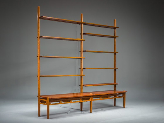 Deze uitzonderlijke rekkenkast uit de jaren 1960, ontworpen door William Watting voor Fristho, combineert tijdloze Scandinavische esthetiek met robuust vakmanschap. De set bestaat uit een massief eikenhouten basis, drie dwarsbalken en negen planken. De met teakfineer afgewerkte bovenbladen geven de kast een warme, Mid Century touch.