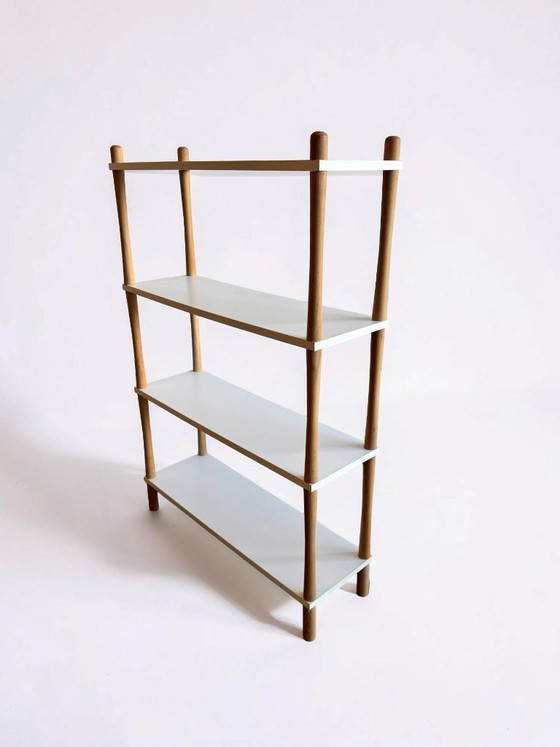 Prachtige vintage stokkenkast met houten staanders en witte planken. Ideaal als boekenkast of als montessori speelgoedkast. In prachtige conditie! Kan met de post verzonden worden.