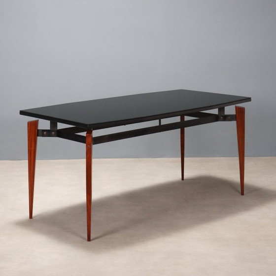 Elegante tafel met mahoniehouten poten en een zwart geëmailleerd metalen frame, een houten blad met een achterkant van behandeld glas. Volledig gerestaureerd.
