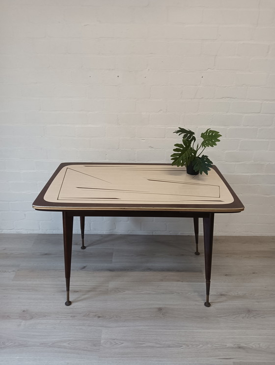 Mooie vormgeving op blad, en zijranden. Zeker wat gebruiker sporen bij deze tafel uit de jaren 50. Zie de foto's. Maar solide en heel uniek.